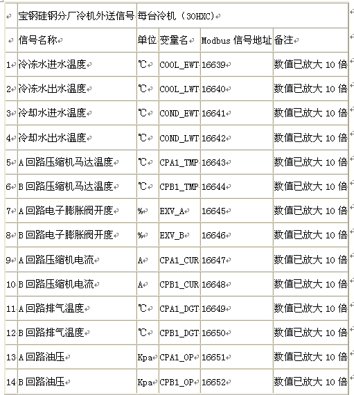 在宝钢的硅刚的生产车间里,一共有四条生产线用到了彩神ll购彩大厅-彩神购彩购彩大厅-welcome彩神彩神-彩神8争霸登录入口-网信welcome彩票彩神-彩神welcome购彩中心-彩神8购彩-彩神争8谁与争锋appPB-B-MODBUS485的总线桥。整个系统采用的是Profibus-DP网络,主站用的是东芝的V3000s3pu55b PLC,组态软件用的是SyCon,监控软件用的是TMEIC-V-TOOL SYS。下面主要连接的是德国SMS公司的一些IO设备,冷机组用的是开利(Carrier)的30HXC190,由于开利冷机组是MODBUS的接口,不能直接联到整个系统中,用到了彩神ll购彩大厅-彩神购彩购彩大厅-welcome彩神彩神-彩神8争霸登录入口-网信welcome彩票彩神-彩神welcome购彩中心-彩神8购彩-彩神争8谁与争锋app公司的PB-B-MODBUS485将其接入到PROFIBUS-DP系统中。表1为主站需要的冷机的参数。