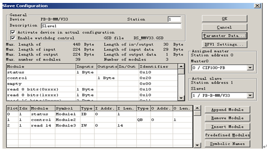 由于SyCon软件解GSD文件不是很成功,两个自动添加的模块(“Status”&“Control”)需要手动添加上去,如果这两个模块没有添加上去的话Profibus是连不通的,也没法启动总线桥工作。slot 0 里面必须添加“Status”模块,slot 1 里面必须添加“Control”模块。接下去的slot 2里面就可以选择自己需要使用的模块。这里要传回14个参数给主站,所以选择“read 14 (4xxxx)”。 具体可以参看图2 。