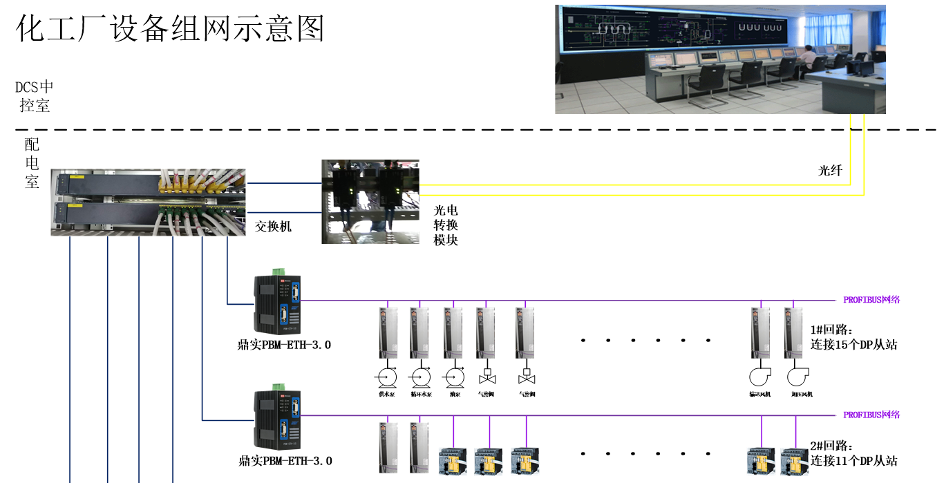 上图所示为山东某化工厂中炭黑生产某环节中设备连接示意图。现场有大量的阀门、水泵、油泵、风机、升降机等设备,有的通过变频器驱动,有的通过电机保护器进行控制、监测、保护、管理。变频器以丹佛斯品牌为主,电机保护器用的是西门子SIMOCODE pro(电机管理和控制设备)系列产品,接口都为PROFIBUS DP(从站)。本例中一个配电室大约有90台设备,控制6条回路,每条回路有10-20个DP从站。为了方便维护和管理,每个回路用一个PBM-ETH-3.0模块(PROFIBUS DP主站)。PBM-ETH-3.0模块在以太网侧做MODBUS TCP服务器,连接交换机、光电转换器,通过光纤接入远处的霍尼韦尔DCS中控室,实现现场设备到DCS的连接。