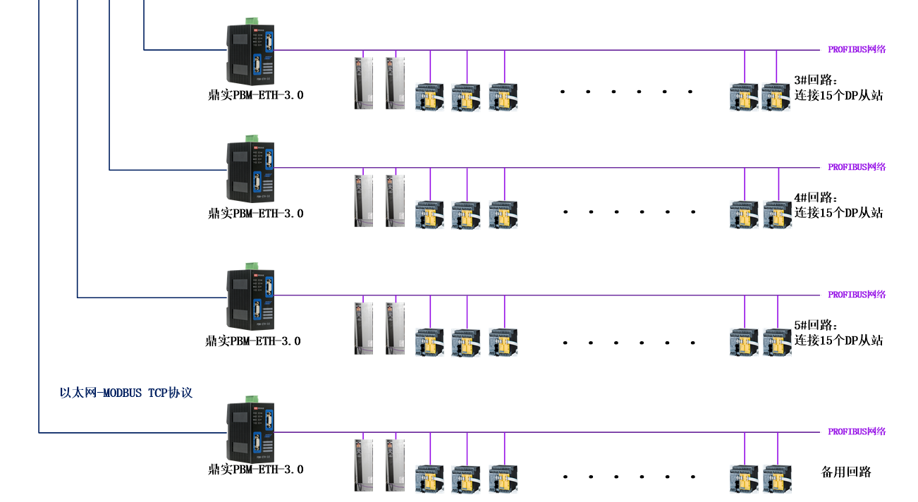 本产品在DP侧有两个DP口,每个DP口在物理层上是一个独立的DP网段,根据PROFIBUS安装规范,1个接口最多可以连接31个DP站点,两个口最多连接62个DP站点,且无需额外的PROFIBUS中继器。这样就非常适合化工厂配电室中海量的电气设备,如电机保护器、变频器、电力仪表、开关设备等DP从站的连接。