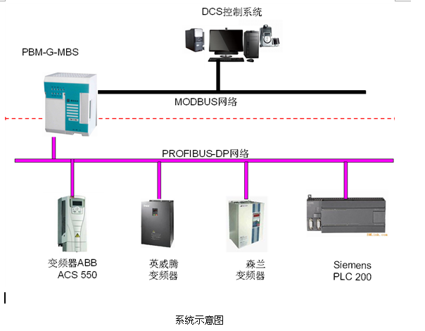 山东X公司在某个化工类项目采用的分布式控制系统DCS,其主控系统主要使用的是Modbus协议;而远程现场设备采用的是PROFIBUS-DP协议。若要将现场设备的数据传输到主控系统并进行监控,就必须实现两种不同协议设备之间的通信转换。此项目中现场设备包括:ABB ACS 550系列的变频器、英威腾变频器、森兰变频器以及siemens 200 PLC,均为PROFIBUS-DP从站;而主控系统DCS为Modbus主站。因此,该项目需要一种Modbus/PROFIBUS协议转换网关——在PROFIBUS一侧做主站,用于连接一些远程现场设备PROFIBUS-DP从站;在Modbus一侧做从站,接收DCS通信查询,将PROFIBUS一侧的现场设备信息传输到DCS控制器。彩神ll购彩大厅-彩神购彩购彩大厅-welcome彩神彩神-彩神8争霸登录入口-网信welcome彩票彩神-彩神welcome购彩中心-彩神8购彩-彩神争8谁与争锋app的主站网关PBM-G-MBS专为此应用场合设计,可对PROFIBUS-DP从站组网,将PROFIBUS数据转换成Modbus协议上传至Modbus主控设备。