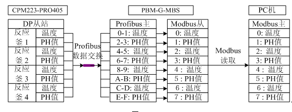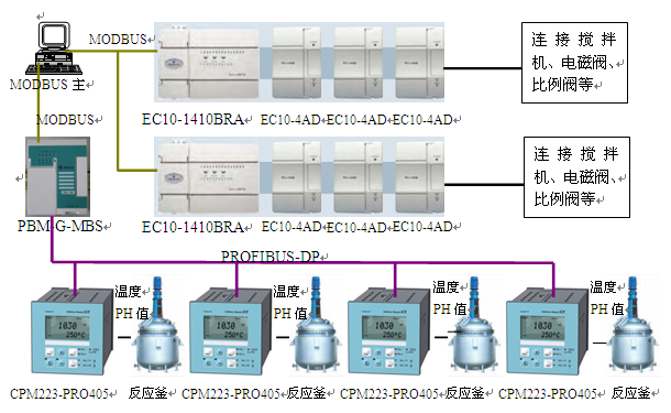 主模块用的是艾默生EC10-1410BRA,本身具有14点DC输入10点继电器输出,后面带有三块4路的模拟量扩展模块EC10-4AD。他们组成两套系统来分别控制4个反应釜,连接的设备有反应釜的搅拌机,进料的电磁阀以及比例阀等。4个反应釜的温度以及PH值等参数通过E+H的变送器CPM223-PRO405来采集,此变送器提供的接口为PROFIBUS-DP,所以就用到了主站网关PBM-G-MBS。主站网关在这里做MODBUS的从PROFIBUS-DP的主,PC机里面用户自己编写程序模拟做MODBUS主站将网关将采集的数据读上来,然后将数据传送给EC10-1410BRA。具体请参看图1。