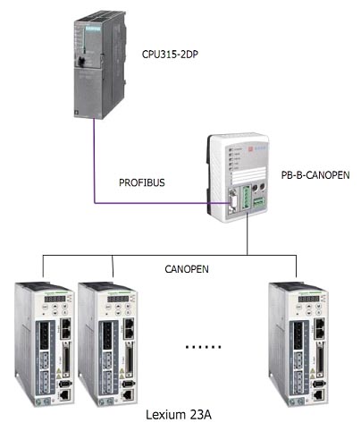 施耐德集团公司是世界著名的电控产品厂商,其产品LXM23A伺服控制器以其优越的性能在运动控制领域有着广泛的应用。该伺服控制器本身自带的是CANOPEN通讯,在遇到主控系统是PROFIBUS通讯时(如西门子300、400PLC),需要解决PROFIBUS到CANOPEN协议的快速转换问题。北京彩神ll购彩大厅-彩神购彩购彩大厅-welcome彩神彩神-彩神8争霸登录入口-网信welcome彩票彩神-彩神welcome购彩中心-彩神8购彩-彩神争8谁与争锋app创新科技有限公司的PB-B-CANOPEN总线桥起到PROFIBUS到CANOPEN的协议转换作用,其特点是通讯速度快,使用方便灵活。如下图1-1所示,该系统中由西门子PLC(CPU 315-2DP)控制施耐德伺服控制器Lexium 23A的起停,速度给定等,同时要监测伺服控制器状态字等相关参数。现以连接一台伺服控制器为例说明。