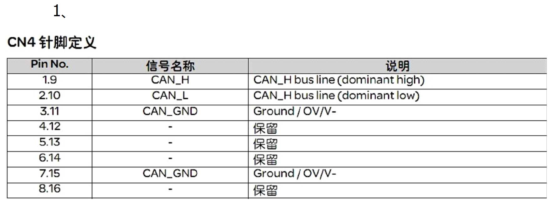 1、 接线:施耐德伺服的CN4为CANOPEN口,CN4各针脚定义如图2-1所示,其中针脚1与总线桥CAN五针端子的H相连,针脚2与总线桥CAN五针端子的L相连。