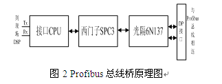 Profibus总线桥是本系统一个重要的部分,它是一个专为Profibus-DP通信功能开发的产品,其硬件原理图如图2所示。它本身包含一个接口CPU,为总线桥的外部硬件提供两个端口:一个串行通讯接口TXD和RXD,一个与Profibus网络连接的A和B。在本系统中,接口CPU主要和现场DSP进行数据交换,通过TXD和RXD分别现场DSP串口B的SCIRXDB和SCITXDB相连接。现场DSP将双口RAM中需要的数据读取后通过串行通讯传递给接口CPU,由接口CPU将传输过来的数据和西门子Profibus通讯协议芯片SPC3进行数据交换。这样,SPC3将通信得到的数据以Profibus-DP的形式发送出去,转化成该标准接口接入到总线中去,反方向的数据传输与之类似。于是变频系统将变成接入Profibus网络上的一个节点。从而可以使我们在不需要在对Profibus数据链路层访问协议充分研究的基础上用单片机建立一个Profibus-DP从站,在短时间内便可完成变频系统的Profibus的开发。