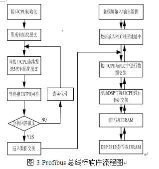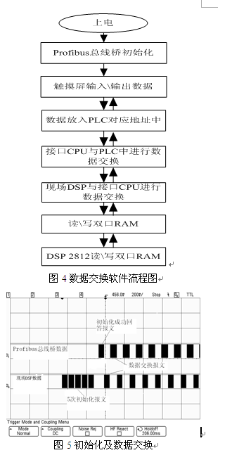软件部分首先是现场DSP对Profibus总线桥进行初始化,初始化完成后立即进入Profibus总线桥和现场DSP数据交换的无限循环,进而进行DSP 2812和PLC、触摸屏之间数据通讯。