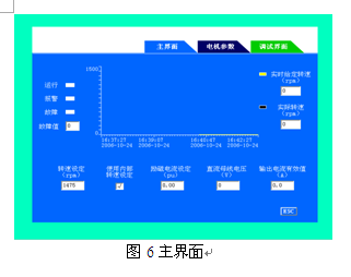 对于触摸屏的我们采用西门子的组态软件Protool进行组态,设计界面包括:主界面、电及参数界面和调试界面三个部分组成。主界面用于设定变频系统的工作状态,如电流、电压、速度给定、实际速度反馈、故障代码等信号;电机参数界面用于设定电机的相关参数,调试界面则是调试时输入的相关参数,如电流、电压调节器的相关参数等。图6是用Protool组态的主界面图。