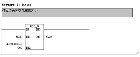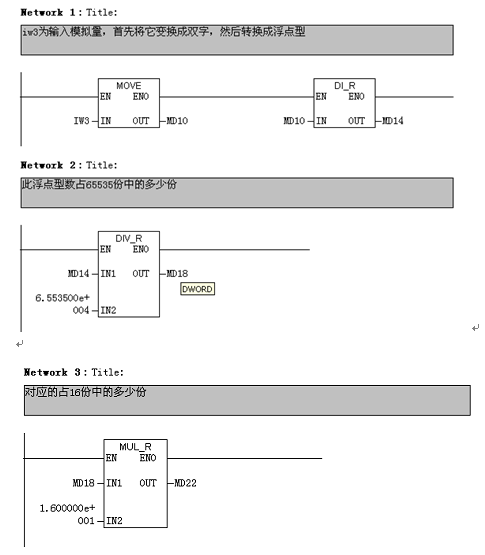 CC-PB-1.0模块采集模拟量。本工程现场仪表使用4-20mA,对应的无符号的值为0-65535,那么将测量到的一个无符号的值换算成4-20 之间即可。假设测量值为M,换算公式为:(M/65535)*16+4。以下为的计算程序,IW3(本程序中为IW560)为输入值。