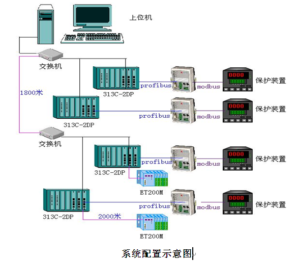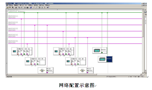 在本系统网络中包括了Ethernet、Profinet、Profibus和Modbus。上位计算机与4台PLC、4台PLC之间通过Etherne进行通讯;ET200M远程I/O与313C-2DP之间通过Profinet通讯;PB-B-MM/V33总线桥以DP从站的方式与313C-2DP通讯,以Modbus主站的方式与保护装置通讯。网络配置如下图: