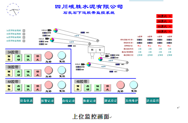 操作人员通过上位计算机,可以图表方式显示设备的运行状态、故障类型和运行数据,可单控相关设备的运行/停止,可集控胶带机全线设备启动运行和停止。系统采用控制功能分开的方法,即:上位机执行显示、操作、报警、储存等功能, PLC执行保护、控制和数据的采集等功能。
