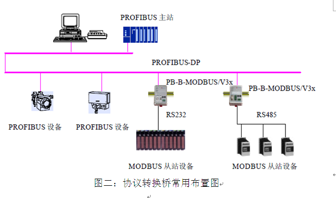 平朔项目采用了北京彩神ll购彩大厅-彩神购彩购彩大厅-welcome彩神彩神-彩神8争霸登录入口-网信welcome彩票彩神-彩神welcome购彩中心-彩神8购彩-彩神争8谁与争锋app科技创新有限公司生产的PB-B-MM/485/V3.3协议转换桥,该接口是PROFIBUS总线桥系列中的产品,可将具有RS232/485、CAN及MODBUS等专用通信协议的接口设备连接到PROFIBUS总线上,使设备成为PROFIBUS总线的一个从站。该设备在接口RAM 中建立了PROFIBUS到MODBUS映射数据区,由软件实现PROFIBUS和MODBUS的协议转换及数据交换。该协议转换桥常用布置如下: