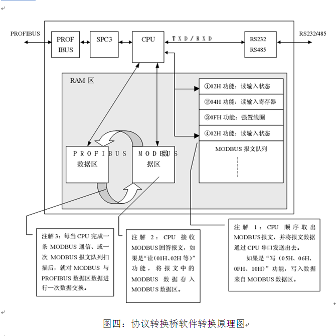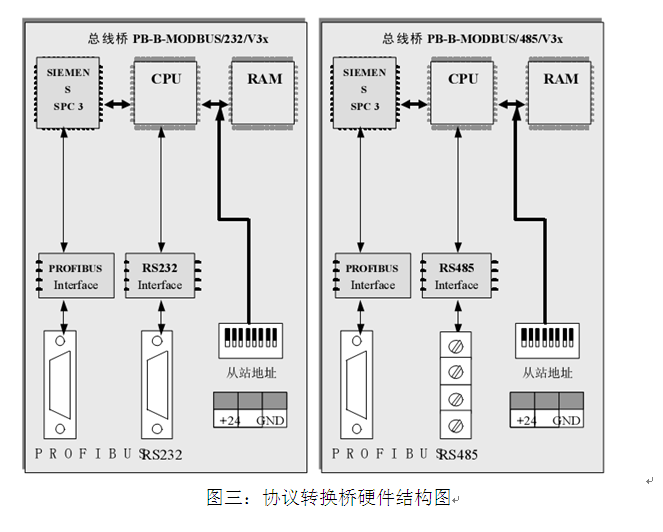 PB-B-MODBUS/232/485/V3x是智能型PROFIBUS到MODBUS-232/485的协议转换接口。在接口RAM中建立了PROFIBUS到MODBUS映射数据区,图三中SPC3是西门子公司的PROFIBUS通信协议芯片。PROFIBUS Interface是PROFIBUS标准驱动电路,由光隔及RS485驱动组成。RS232 Interface是标准的RS232驱动电路,由光隔及RS232驱动芯片组成。CPU通过对SPC3控制实现PROFIBUS的通信并在RAM中建立PROFIBUS通信数据缓冲区。另一方面,通过RS232 Interface实现和外部 MODBUS现场设备的通信,同样在RAM中建立MODBUS通信缓冲区。CPU通过两个通信缓冲区的数据交换,实现PROFIBUS到MODBUS的通信。
