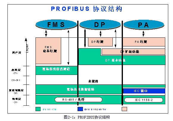 (2) PROFIBUS-FMS:定义了第一、二、七层,应用层包括现场总线信息规范(Fieldbus Message Specification-FMS)和低层接口(Lower Layer Interface-LLI)。FMS包括了应用协议并向用户提供了可广泛选用的强有力的通信服务。LLI协调不同的通信关系并提供不依赖设备的第二层访问接口。