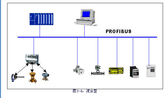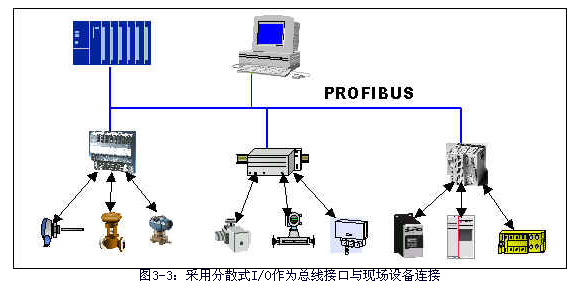 (3) 混合型:现场设备部分具备PROFIBUS接口。这将是一种相当普遍的情况。这时应采用PROFIBUS现场设备加分散式I/O混合使用的办法。无论是旧设备改造还是新建项目,希望全部使用具备PROFIBUS接口现场设备的场合可能不多,分散式I/O可作为通用的现场总线接口,是一种灵活的集成方案。见图3-4。