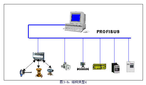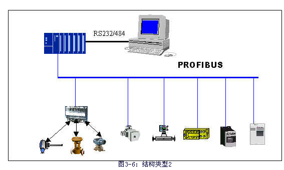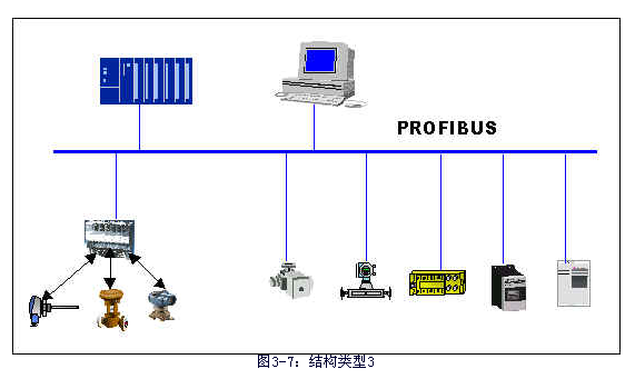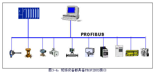 (2) 单一总线型: 现场设备都具备PROFIBUS接口。这种一种理想情况。可使用现场总线技术,实现完全的分布式结构,可充分获得这一先进技术所带来的利益。新建项目可能具有这种条件,就目前来看,这种方案设备成本会较高。见图3-4: