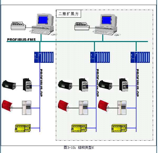 (6) 结构类型6: 使用两级网络结构,这种方案充分考虑了未来扩展需要,比如要增加几条生产线即扩展出几条DP网络,车间监控要增加几个监控站等,都可以方便进行扩展。如图3-10所示,采用了两级网络结构形式,充分考虑了阴影部分的扩展余地。