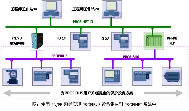 PROFINET作为PROFIBUS的升级技术,必须考虑到保护已使用PROFIBUS用户的投资;即:必须为PROFIBUS设备与PROFINET系统连接提出解决方案。国际PI为此提出的解决方案是:使用PROFINET/PROFIBUS(以下简写为PN/PB)网关实现PROFIBUS设备集成并连接到PROFINET系统中。如下图:使用PN/PB网关实现PROFIBUS设备集成到PROFINET系统中。