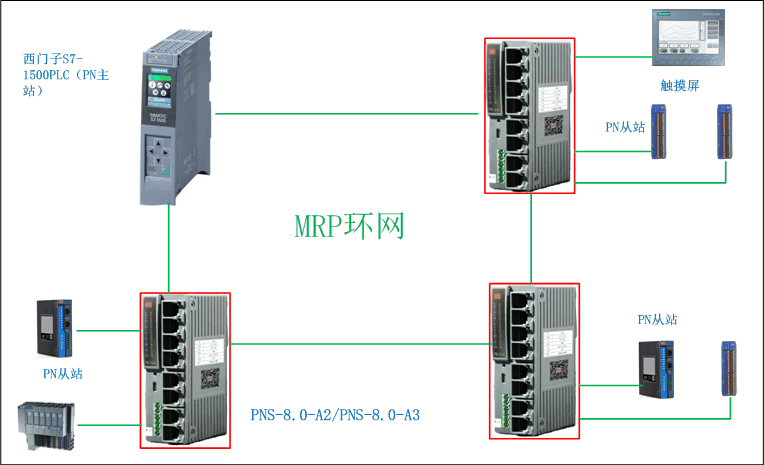 通过PNS-8.0-A2/A3型交换机可以将设备组成MRP环网,示意图如下: