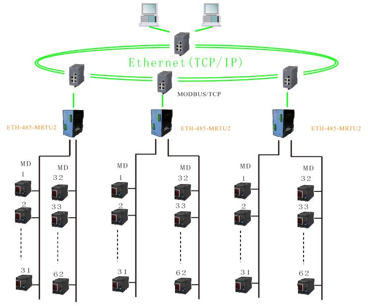 以太网MODBUS/TCP到MODBUS/RTU网关主要用于以MODBUS/TCP为主干网络的DCS系统,或者在MODBUS/PLC的控制系统中,将MODBUS/RTU设备(如:电机保护器MCC、电量测量仪PCC、变频器、I/O等)连接到以太网系统中。本产品的技术特点为海量、高速,海量即可将大量MODBUS/RTU仪表,接入以太网中,单台网关在不需要RS485物理层的扩展设备的情况下可直接连接62个MODBUS/RTU从站设备;高速即存储器共享型的工作原理保证在连接大量仪表的情况下,每台MODBUS/RTU仪表中的数据在以太网中的更新周期小于1秒。本产品广泛应用于工厂电力监控,能源监管等工程项目中,为不具备以太网接口的各类电气仪表,水表接入DCS网络、中控室等环境提供有效的解决方案。